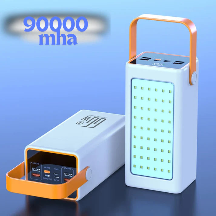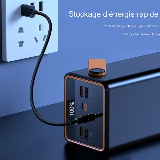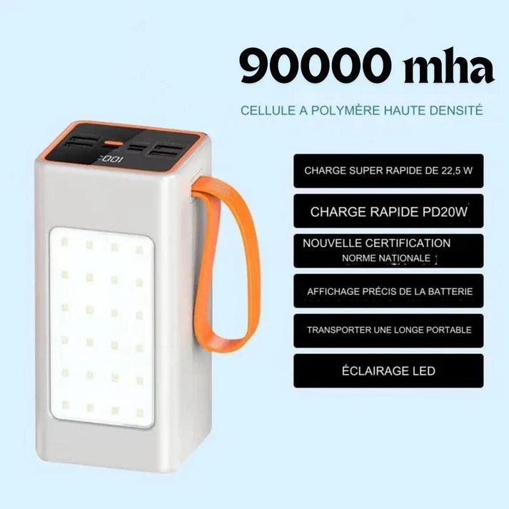 Autonomie exceptionnelle de la batterie : ne craignez plus de manquer de batterie. Avec sa capacité de 90 000 mAh, vous pourrez recharger vos appareils plusieurs fois avant de devoir recharger la batterie externe elle-même.