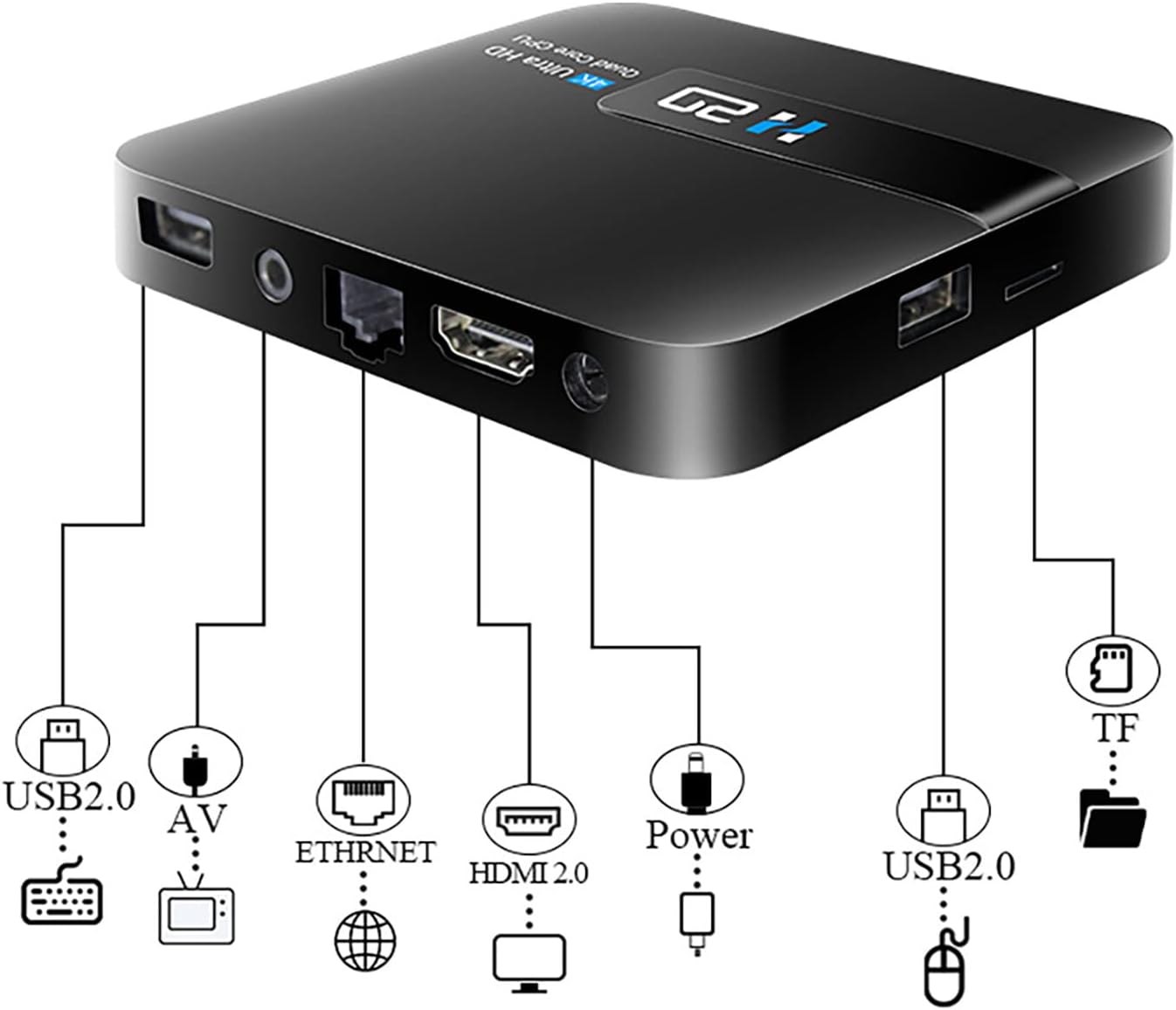 Avec des options de connectivité complètes, la Smart TV Box H20PRO s'intègre facilement à votre réseau domestique ou utilisez les ports HDMI et USB 2.0 pour connecter vos appareils préférés. Plus de soucis, juste du plaisir.