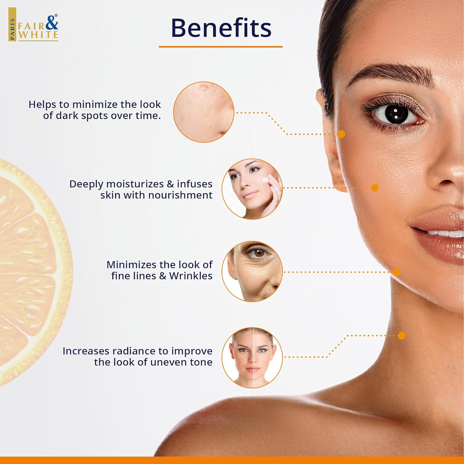 La crème Fair & White aide à équilibrer votre peau, vous permettant de trouver la combinaison parfaite d'huile de ricin, de glycérine et de vitamine C, cela facilitera le processus de régénération naturelle de la peau et réduira les dommages cutanés et l'apparence des imperfections cutanées.