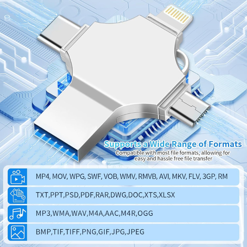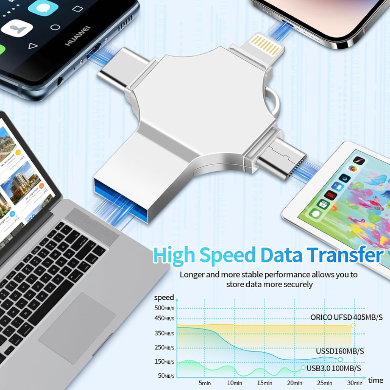 Vous recherchez une solution de rangement universelle et pratique pour tous vos appareils? Notre mini clé USB 64GB en métal à double usage 4 en 1 est la solution à tous vos besoins de transfert et de sauvegarde de données.