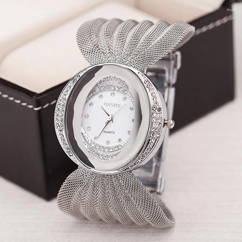 Ce qui distingue également cette montre, c'est son bracelet en acier inoxydable, avec un simple cadran ovale clouté qui ajoute une touche de luxe à cette pièce intemporelle et la rend plus belle, tandis que le bracelet en maille lui donne une touche de féminité et de douceur au poignet.