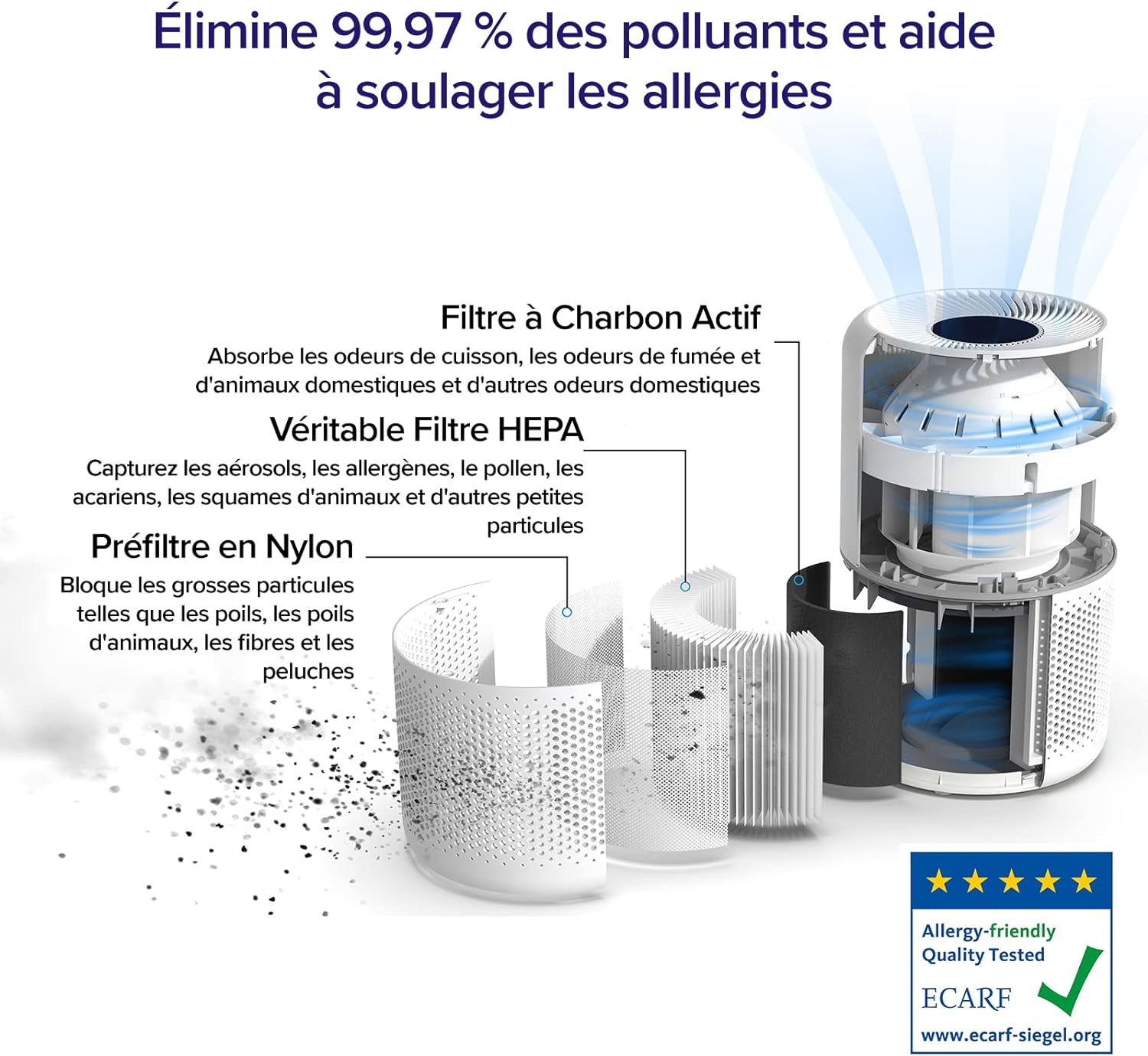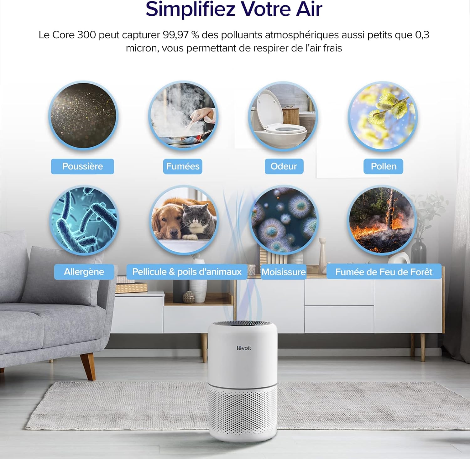 🍃 TECHNOLOGIE DE FILTRATION AVANCÉE : Notre purificateur d'air de pointe sont équipé de véritable filtres HEPA, capturant 99,97 % des particules en suspension aussi petites que 0,3 microns, des allergènes aux squames d'animaux, de la poussière, de la fumée et du pollen, améliorant la qualité de votre air intérieur.